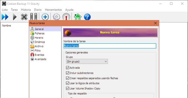 - Abre Cobian Backup y selecciona «Crear una nueva tarea» en la barra de herramientas.