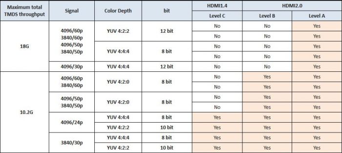 Y si estamos usando una conexión HDMI antigua, el cable ni siquiera podrá transportar la información de color adicional. Como vemos en la tabla, (sacada de AVSForum), con una conexión HDMI 1.4 no es posible una profundidad de color de 4:4:4 en las resoluciones y tasas de refresco más altas, como 4K a 60 frames por segundo.